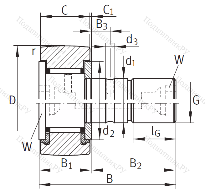 Подшипник KR 62 PP его конструкция практически полностью повторяет роликовые подшипниковые системы за исключением наличия втулки, которая является одновременно дорожкой качения, выполняя тем самым функцию отсутствующей внутренней шины (движение осуществляется по утолщенной головке стержня). На поверхности детали находится смазочный канал, через который осуществляется обслуживание (загрузка смазочного материала). Наружная шина утолщена и имеет сферическую (выпуклую) форму. Может комплектоваться игольчатыми роликами или другими подшипниковыми телами.