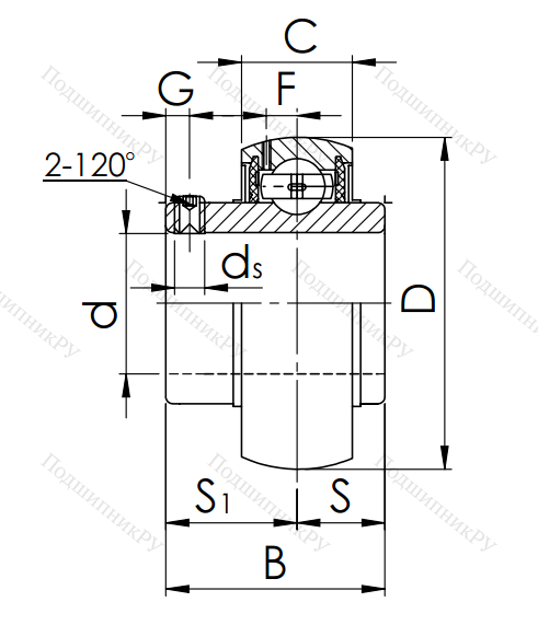 Шариковое радиальное подшипниковое тело, имеющее однорядную конструкцию с расширенной внутренней шиной и двумя уплотнениями. Данное кольцо может выпускаться с различными вариантами крепежа: втулка для закрепления, стопорное эксцентриковое кольцо, винты. Конструкция предназначена для работы совместно с корпусами типов UCP, UCT, UCF, UCPA, UCFL с шириной или высотой подшипника B(H): 42.9мм.